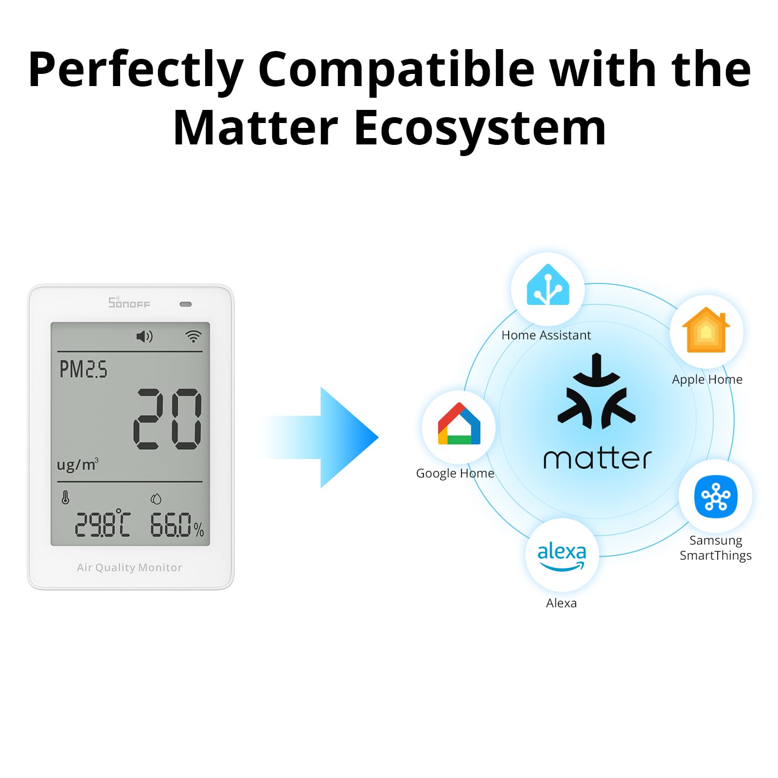 - [Matter Compatibility] As an Air Quality Meter that supports the Matter ecosystem, it can seamlessly integrate with various smart home platforms (including Apple Home, Amazon Alexa, Google Home, SmartThings, and Home Assistant).